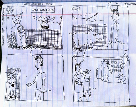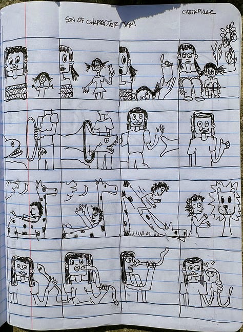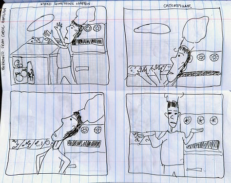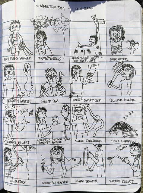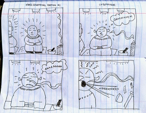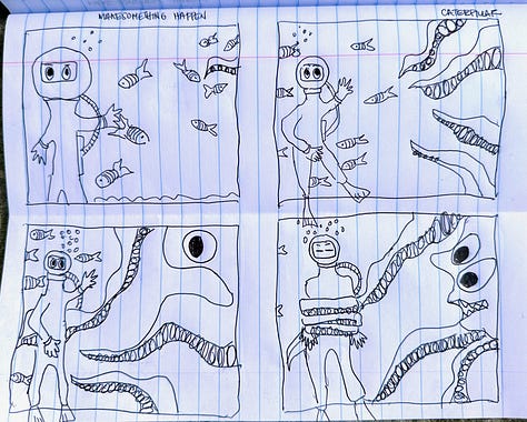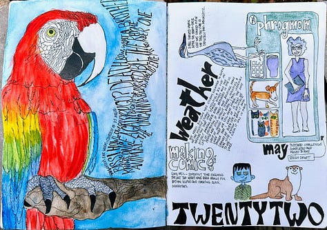Our read-along for Lynda Barry’s Making Comics continues to intensify. She has us making four frame comics now. I never think I am going to be able to come up with a good idea and then it just happens. Fortunately the prompts encourage silliness. Nothing makes me freeze up more than the need to be serious.