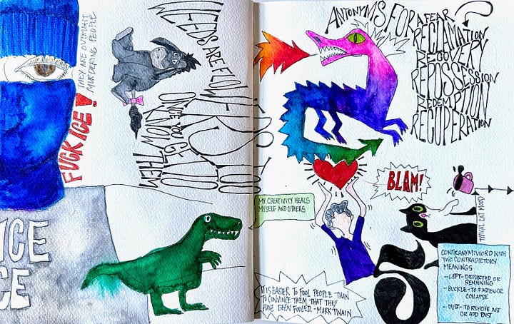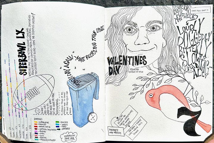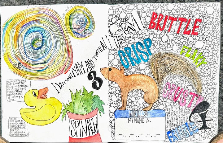 I have been wildly successful (I just wanted an excuse to use this phrase) in getting my illustrated journal going again. I have been drawing almost daily, and resisting getting bogged down in pages that feel unfinished.